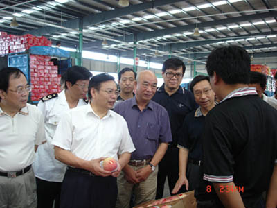 9月8日,无锡市副市长谈学明来朝阳农产品大市场视察。朝阳集团公司董事长张海良、总经理杨兴德分别向市领导汇报了朝阳农产品大市场为确保中秋国庆节日供应,农产品大市场在蔬菜、水果、粮油等商品的组织、储备、供应方面所做的工作。