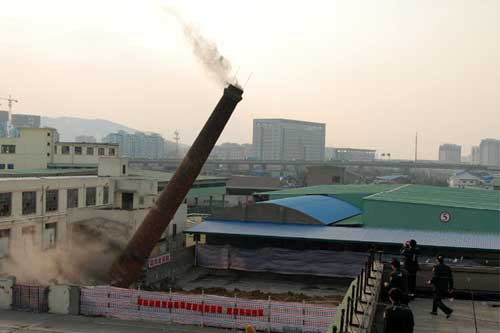 14:45,一阵脆响,烟囱完成了它的历史使命,在空中划过最后一道弧线,悠然倒地,没有震耳的轰鸣,没有强烈的震撼,轻烟散去,眼前豁然开朗,市场这一瓶颈终于疏通。