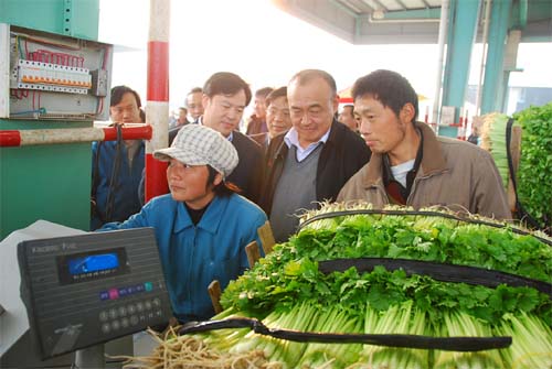 蒋主任一行还来到正在紧张进行中的蔬菜交易现场,与菜农、商户进行洽谈,了解近期蔬菜上市情况和价格走势。当得知近期蔬菜价格有大幅回落、蔬菜供应得到保证,蒋主任一行对朝阳集团就此所作的努力大为赞赏。