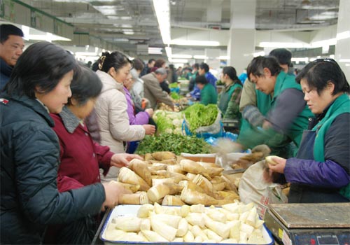 “大白菜0.4元/斤,萝卜0.5元/斤,花菜1.3元/斤”,在朝阳农贸市场一楼卖蔬菜的王老板,一天销量在5000斤左右。提起价格,王老板反映比去年同期便宜,像大白菜去年要卖到1元/斤。冬笋只卖8元/斤,而去年卖到12-13元/斤。经营户表示,今年是冬笋产量的大年,货源多,春节前涨幅不大。