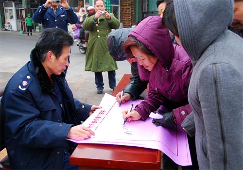 市场全体客商在“经营户食品安全倡议书”上签名。