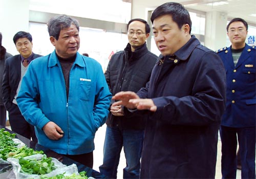雪后初晴,无锡市副市长曹佳中率工商、农林、食品安全等部门的领导,来到无锡朝阳农产品大市场,检查春节前供应及食品安全工作。半岛官网平台总经理杨兴德陪同曹副市长一行进行实地检查。