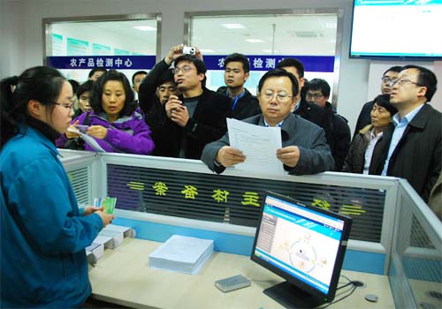 在位于无锡朝阳农产品大市场的蔬菜备案中心,常司长一行仔细查验了蔬菜经营者注册备案流程。半岛官网平台总经理杨兴德向督查组汇报了半岛官网平台依托农产品大市场,并结合本溯源项目,投入大量的人力、资金,切实开展农产品电子化交易结算,认真实施农贸市场溯源节点管理,在批发市场、农贸市场、连锁超市农产品追溯等方面均取得了显著的成效。