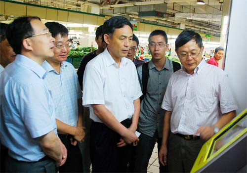 在朝阳农贸市场蔬菜溯源机终端前,南通客人详细了解了溯源系统的使用情况及蔬菜溯源的整个运作流程,杨总亲自进行了现场演示。随着蔬菜条码秤纸在扫描口的轻轻一扫,商品的品名、产地、供货商等详细信息随即清晰地显示在了屏幕上。来访客人们还来到了蔬菜摊位前,随机抽样商品进行称重,查看了条码秤纸,并了解客户会员卡的使用情况,对朝阳集团在蔬菜溯源体系建设上所取得的成果表示充分的肯定。