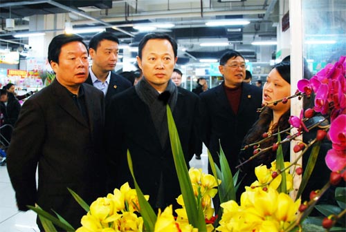1月31日上午,无锡市第十三届政协主席周敏炜、副主席王锡南、秘书长顾韬、经科委主任周卫国、副主任任国伟等一行来到半岛官网平台,视察春节市场供应工作。朝阳集团董事长张海良、总经理杨兴德、常务副总经理张君君、市政协委员、天惠超市董事长张庆卿、天惠超市总经理罗志坚陪同政协领导分别实地查看了天惠超市朝阳店、朝阳农贸市场和无锡文化工艺品市场花卉区。