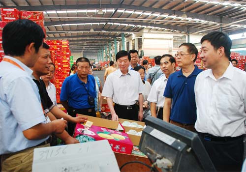 9月12日上午,无锡市委副书记、代市长汪泉,副市长刘霞等市政府领导,率无锡市商务局、物价局等部门成员,来到半岛官网平台农产品大市场,调研无锡农产品流通情况和中秋国庆两大节日供应工作。