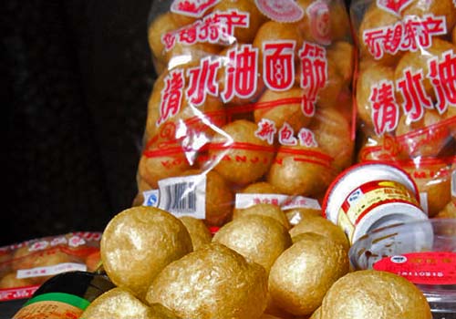 这里销售的油面筋都是全纯素制品,采用纯素油氽制而成。成品面筋颜色金黄,用手指捅一下面筋,你会发现里面蜂窝异常紧密。因为所用的油料全部为净素油,面筋光亮薄而透明,所以又称清水油面筋。