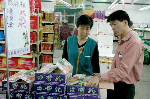 虽然6月初就有阳山水蜜桃早熟品种上市,但为了保证质量,供应天惠超市的定牌包装水蜜桃还是推迟到了6月14日上柜。