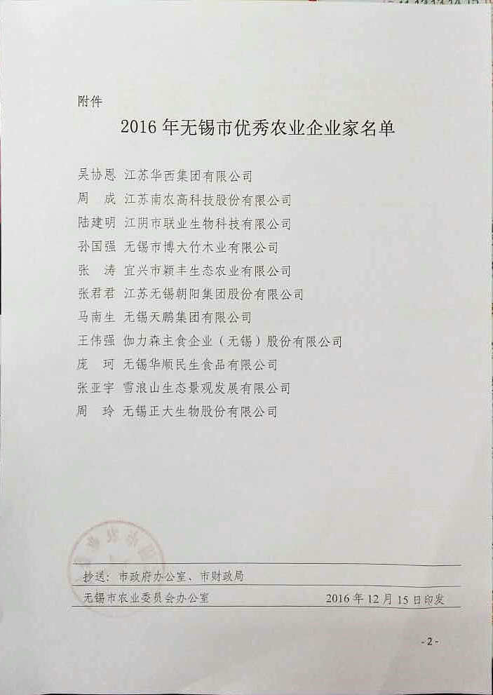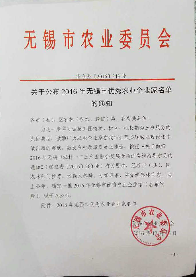 根据无锡市农业委员会锡农委[2016]343号文件精神,半岛官网平台董事长张君君被评为“2016年无锡市优秀农业企业家”。