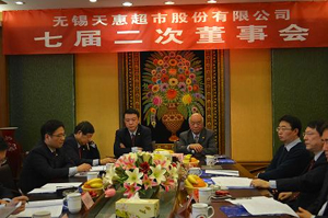 | 无锡天惠超市股份有限公司七届二次董事会于2017年4月15日上午在集团公司三楼第二会议室举行。会议审议并一致通过了《行政工作报告》、《财务工作报告》、《2015—2016年利润预分配方案》、《关于对部份人员的岗位股权激励进行调整的决定》。 会上,董事长张庆卿先生提出,今年天惠超市重点要练好内功,全面改善购物环境、店容店貌,提升服务,抓紧八大类商品,树立天惠品牌。朝阳股份董事长张海良先生针对天惠超市当前面临的问题,指出:1、在管理上,领导干部要以身作则,珍惜岗位,忠于职守,带领好员工做好各方面工作。2、在抓好主业的同时,要有针对性抓薄弱环节,特别是猪肉,要实行店长负责制,都要学会动手操作。3、发展上,有所为有所不为,开关并行,敢于竞争,扩大市场份额。4、根据天惠实际情况,调整好员工收入结构,多劳多得,全面提升劳效。 其他与会董事也分别就2016年天惠超市工作中的成绩给予了肯定,同时对存在的问题给予了中肯的批评和建议。相信在董事会的领导下,在天惠董事长的带领下,天惠超市定会从实际出发,抓住生鲜主业、克服困难、齐心协力,完成2017年度各项任务。