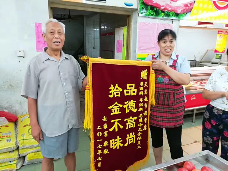 事情的经过是这样的:78日星期六早上,顾客赵先生在天惠稻香超市购物时不慎遗失钱包,被收银员瞿丽群在打扫卫生时捡到,她当时没有任何犹豫,就立即交给了门店经理羊洪新。钱包中不止有身份证,还有现金、银行卡、市民卡等物品,价值过万元。她们以为失主肯定会前来寻找,就一直在店里等人认领,但等了两天失主还是没来。本着为顾客着想的心情,710日,经理羊洪新和员工马慧玲不顾外边下着大雨,凭着钱包里的身份证找到了失主家。当时,又恰逢失主不在家,她们又托人带信请失主到超市认领。当日下午,失主赵先生便到超市认领了钱包,为表感激,当时他主动提出现金酬谢,被羊洪新和员工们当面拒绝。711日早上,失主赵先生特地送给稻香店一面锦旗,表示感谢。