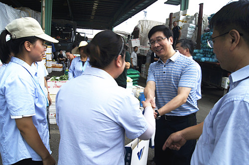 7月27日下午,无锡产业发展集团有限公司党委副书记、工会主席刘涛、副总裁张晓耕等领导在朝阳集团党委书记、工会主席钱韧、副总经理朱健祥的陪同下,冒着高温酷暑,来到朝阳农产品大市场进行慰问。
