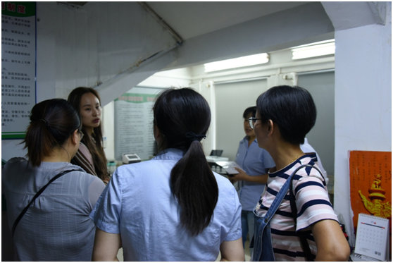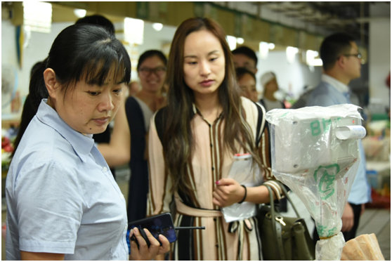 在朝阳农贸市场经理华艳带领下参观市场快捷支付 了解智慧农贸检测流程