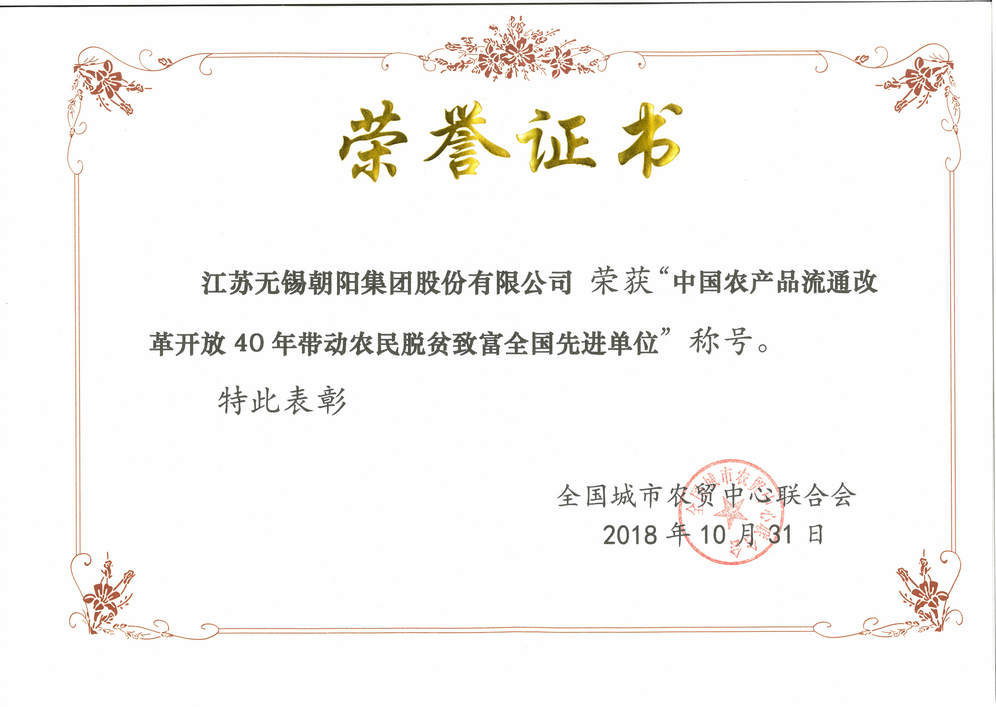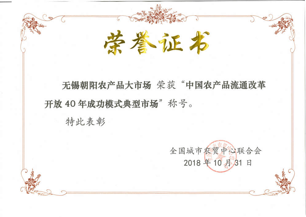 无锡朝阳农产品大市场荣获“中国农产品流通改革开放40年成功模式典型市场”称号;