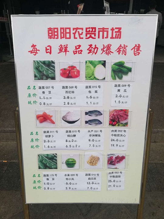 朝阳农贸市场在后疫情时代,响应各方政府“拉动消费”的号召,率先在4月初就推出了“每日鲜品让利销售”活动,市场积极动员全场经营户轮流“一日零利润销售”活动,让利于民。从最早的4个商品逐步增加到12个商品,商品品类不断拓展:蔬菜、肉类、禽蛋、水产、水果、副食品。
