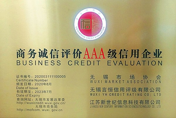 近日,无锡朝阳股份有限公司被无锡市商务局、无锡市场协会评为“商务诚信评价