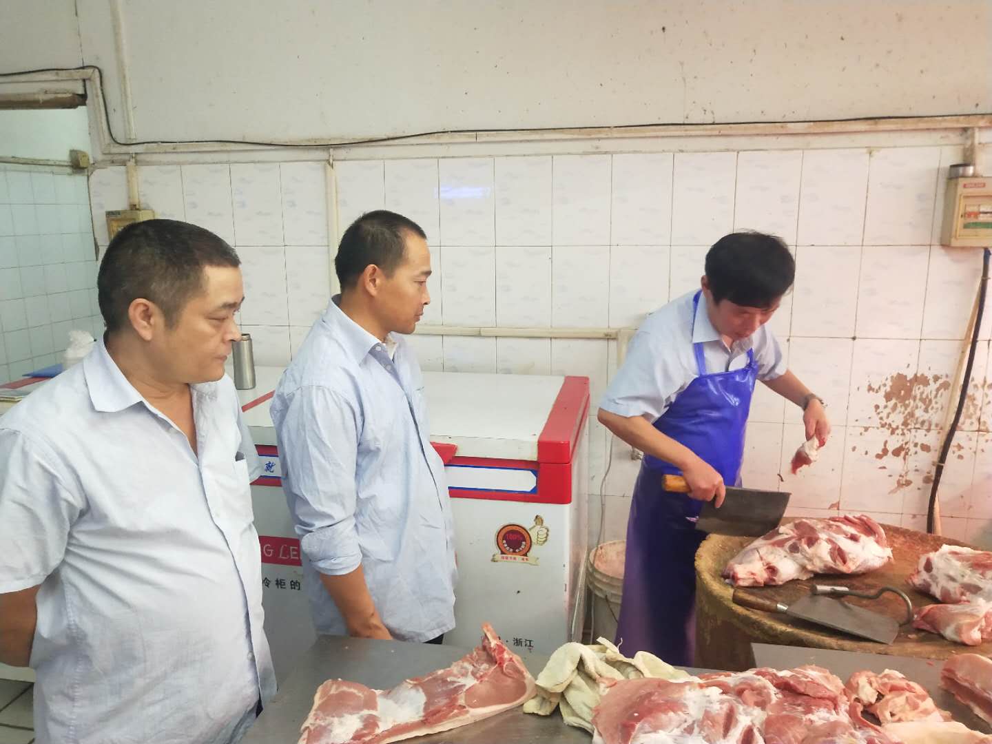 天惠超市荤配部门根据前期的实际销售情况,有针对性地选取需要定向提升技能、统一手势的肉类人员前往学前街店以及盛岸店进行现场培训。优秀的肉类师傅现场进行了分割步骤讲解、重点部位分割演示、猪肉毛利测算及肉类刀具的合理维护使用等三个方面的培训。荤食品配供现场重申肉类加工间管理要求、午市出样要求以及服务态度规范,强调优秀的肉类师傅要积极分享心得,促进整个肉类队伍的技能提升,同时整个肉类队伍要规范分割手势、肉类的规格品种等。