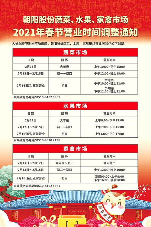 为确保春节期间市场供应,无锡朝阳股份有限公司蔬菜、水果、家禽市场营业时间作如下调整: