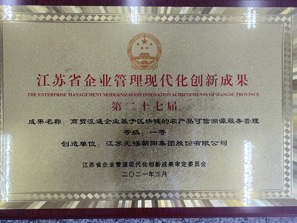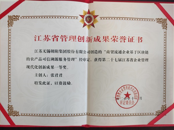 | 5月18日在南京召开的“2021年全省企业管理创新大会”上,由朝阳集团董事长张君君带领的主创团队申报的《商贸流通企业基于区块链的农产品可信溯源服务管理项目》被评为第二十七届江苏省企业管理现代化创新成果一等奖,朝阳集团党委书记钱韧作为企业代表上台领奖。 江苏半岛官网平台股份有限公司此次申报的基于区块链的农产品可信溯源服务管理项目在“创新性、科学性、实践性、效益性、示范性”上得到了省审定委员会及有关专家的高度认可,经过预审、终审及公示无异议后被审定为江苏省企业管理现代化创新成果。 会上,围绕当前企业改革与管理面临的重点、难点问题,组织开展了专题性和区域性交流,加大重点成果的宣传推广,发挥管理创新成果的示范作用。朝阳集团也将在今后的发展中紧扣数字化、信息化和智慧化,结合新形势、新趋势、新特点,使企业发展更多依靠科技进步、管理创新,不断提升劳动者素质,努力提高企业核心竞争力,实现企业高质量发展!