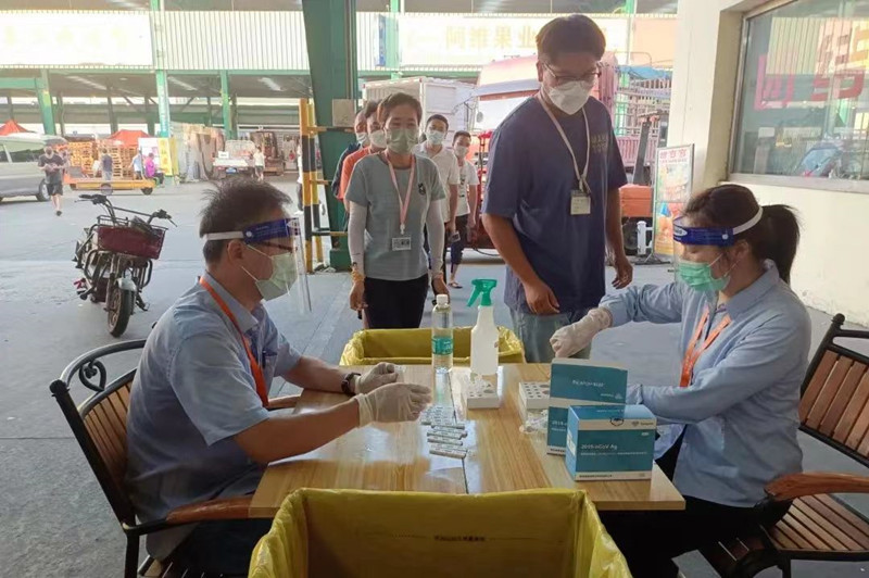 紧急动员,阻击疫情扩散 自疫情开始以来,朝阳股份就实行“抗原检测+核酸检测”的防控手段,即市场人员抗原检测一天两检,入场会员一天一检。7月4日起,朝阳股份调集骨干员工,深入蔬菜市场、水果市场各个大棚,设立抗原检测点,以便市场所有人员能在第一时间完成筛查,并如期完成当天核酸检测。 “每个棚要设立一个点位。”“抗原检测点位的人员如何安排?”“所有人员必须在门岗检查抗原检测显色正常后才可出场。”4日凌晨三点,面对错综复杂的疫情走向与全新而陌生的筛查方式,领导班子、市场经理室成员迅速头脑风暴,短短一个小时完成了点位设立、试剂分发、人员安排、通知下发等一系列工作,在最快时间内保证市场内所有人员抗原检测“做得到、做得快、结果准”。 疫情当下,常态化防控工作不能有任何松懈,无论是烈日骄阳还是风雨交加,无论是“扫码抗原核酸”三件套,还是“代采购代配送”暖心服务,朝阳员工总会出现在最前线。在持续进行的全员核酸及抗原检测工作中,“朝阳力量”勇于担当,冲锋在前,为打造“无疫市场”携手同心,全力以赴,共同构筑了最美的风景线!