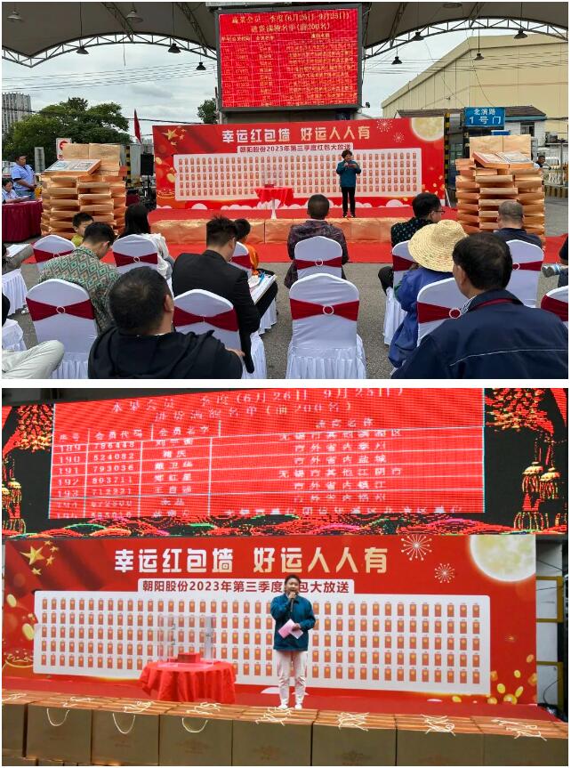 10月6日,朝阳股份隆重举行第三季度红包大放送活动,为广大会员带来了一场欢乐与惊喜的盛宴,也展示了朝阳股份对于会员的持续关怀和回馈。本次活动分别邀请蔬菜、水果两大市场第三季度进货额排名前200名的会员参与抽奖。