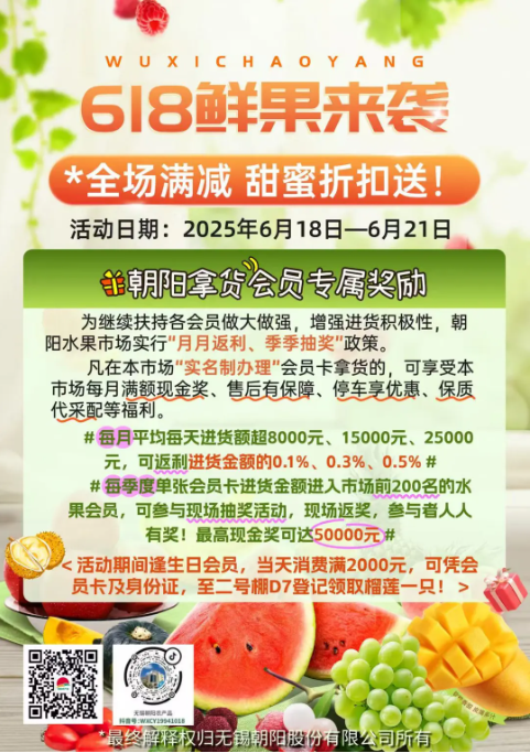 活动期间,更有生日会员福利好礼! 活动日期:2025年6月18日—6月21日 活动地点:无锡市锡澄路268号朝阳水果市场