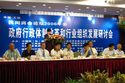 由中国民(私)经济研究会、北京洪范法律与经济研究所、无锡市工商业联合会、半岛官网平台有限公司、无锡益多集团有限公司、无锡比较研究咨询事务所主办,德国ZDH中国办公室、中国改革杂志社等单位协办的“民间商会论坛2006年会-政府行政体制改革和行业组织研讨会”,于2006年8月11日~13日在无锡国际饭店举行。